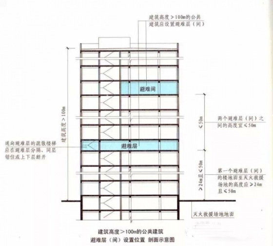 2.完善了公共建筑避難層的防火要求,如,第一個避難層(間)的樓地面至滅火救援場地地面的高度不應(yīng)大于50米,兩個避難層(間)之間的高度不宜大于50米;