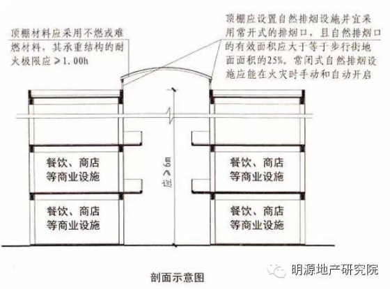 5.步行街兩側(cè)建筑的商鋪,其面向步行街一側(cè)的圍護(hù)構(gòu)件的耐火極限不應(yīng)低于1小時。相鄰商鋪之間面向步行街一側(cè)應(yīng)設(shè)置寬度不小于1米、耐火極限不低于1小時的實(shí)體墻;當(dāng)步行街兩側(cè)的建筑為多個樓層時,每層面向步行街一側(cè)的商鋪均應(yīng)設(shè)置防止火災(zāi)豎向蔓延的措施;