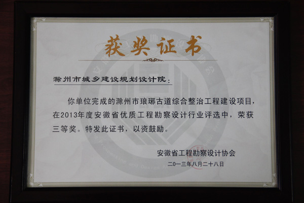 安徽省工程勘察設(shè)計(jì)協(xié)會(huì)于2013年8月3日組織專家召開安徽省優(yōu)秀工程勘察設(shè)計(jì)行業(yè)獎(jiǎng)評審會(huì),對全省共62家單位上報(bào)的320個(gè)項(xiàng)目進(jìn)行了為期兩天的評選。由我院市完成的滁州市瑯琊古道綜合整治工程建設(shè)項(xiàng)目在2013年度安徽省優(yōu)秀勘察設(shè)計(jì)行業(yè)評選中,榮獲三等獎(jiǎng)。