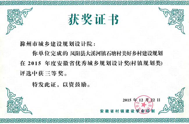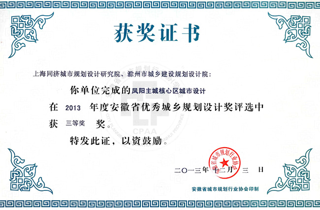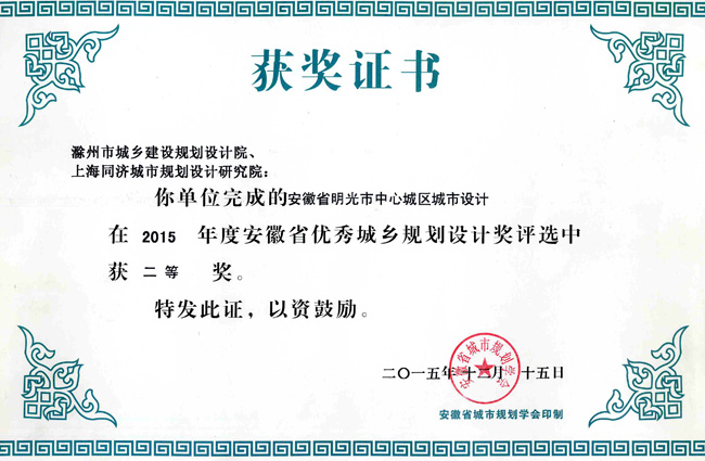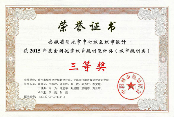 明光市中心城區(qū)規(guī)劃獲獎(jiǎng)證書